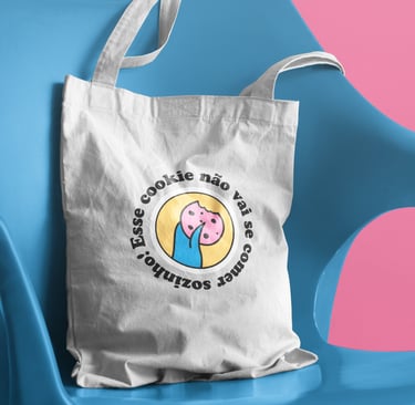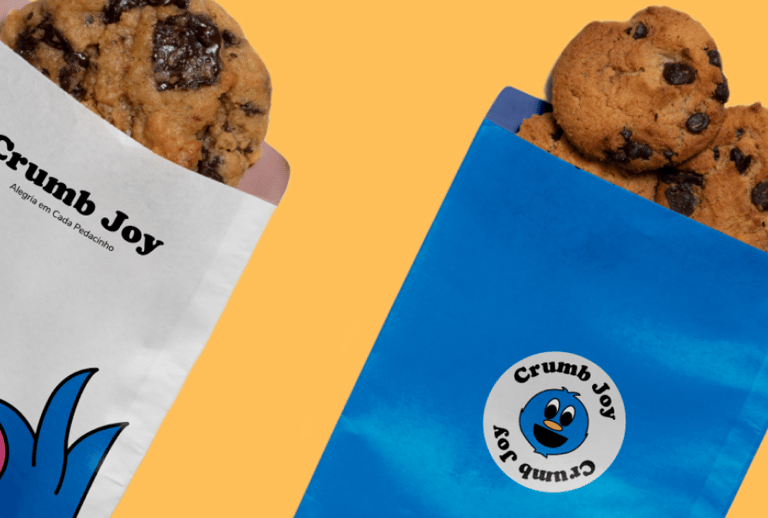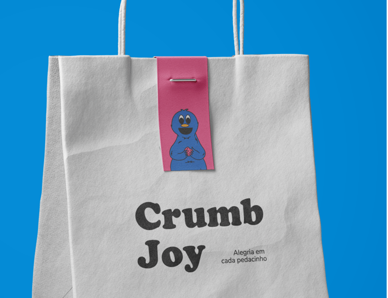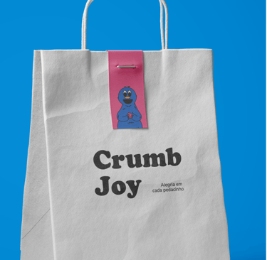A tagline, Alegria em Cada Pedacinho, vem do próprio nome da marca, “Crumb Joy” combina a palavra "crumb" (migalha em inglês), que remete à textura crocante dos cookies, com "joy" (alegria), capturando a essência do prazer que seus cookies proporcionam.