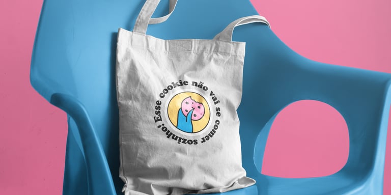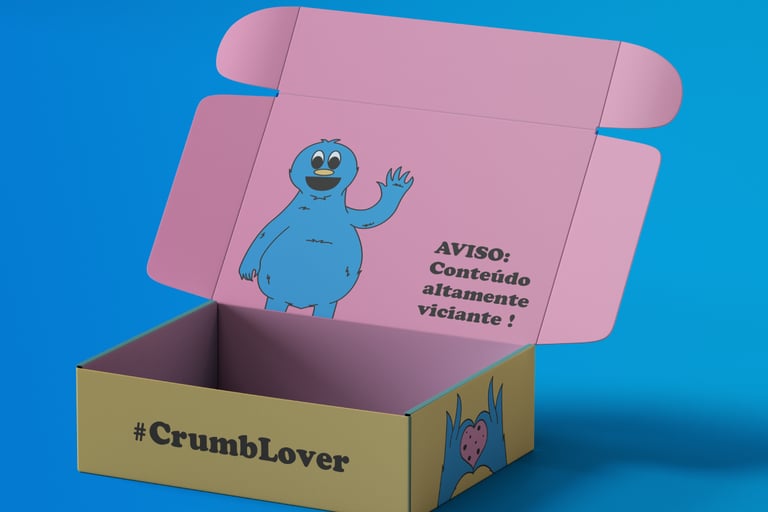 Ana e Pedro pediram que a Crumb Joy, tivesse um mascote, então buscamos inspiração no Cookie Monster de Vila Sésamo, personagem do desenho favorito de ambos quando criança, para criar o Joyzinho - o mascote da marca.